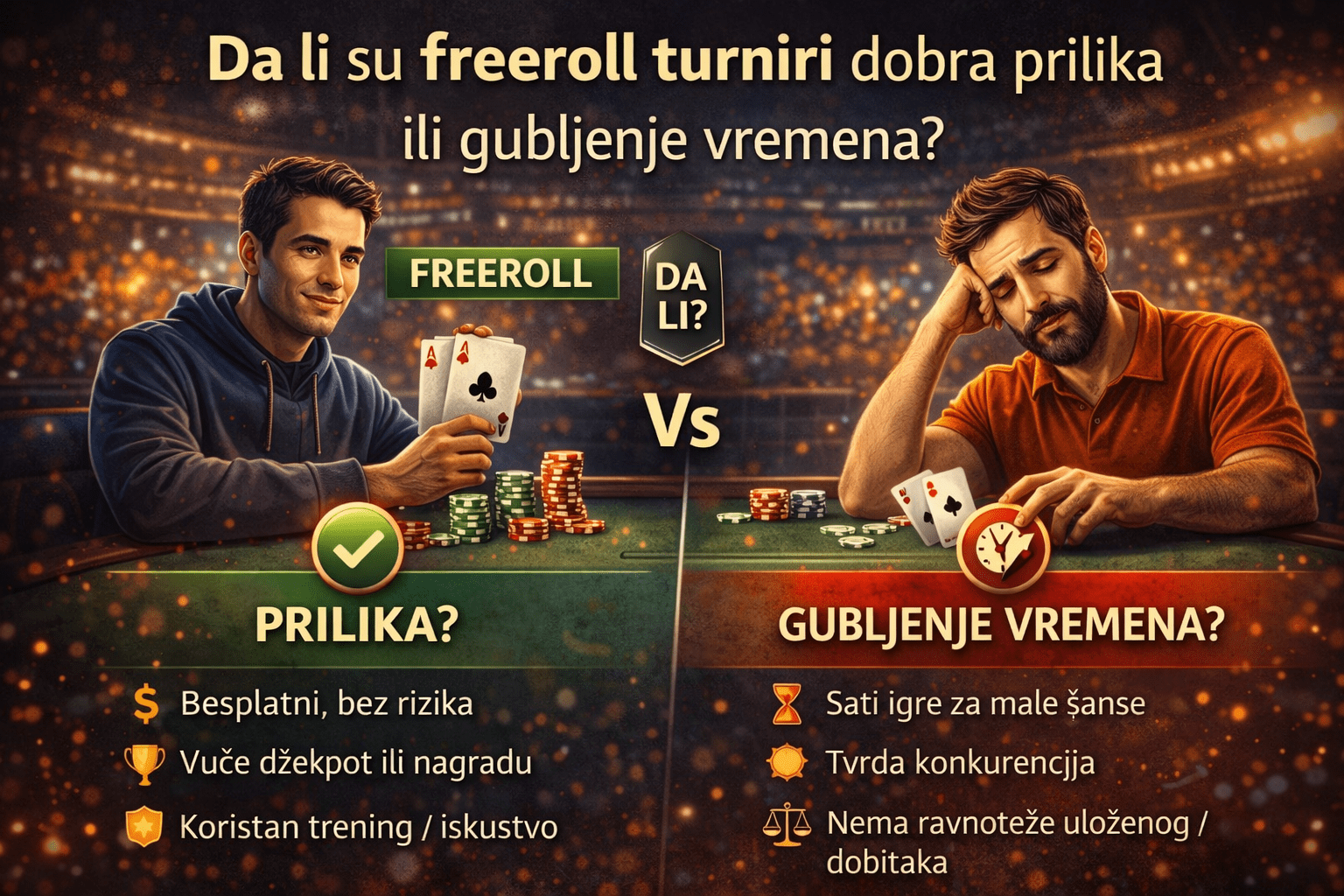 Freeroll turniri poker su često prva stvar koju početnici vide kada uđu u svet online pokera. Ideja zvuči savršeno, igraš bez ulaganja i možeš osvojiti pravi novac. Ali pitanje koje se postavlja je mnogo realnije: da li su freeroll turniri zaista dobra prilika ili samo gubljenje vremena?
