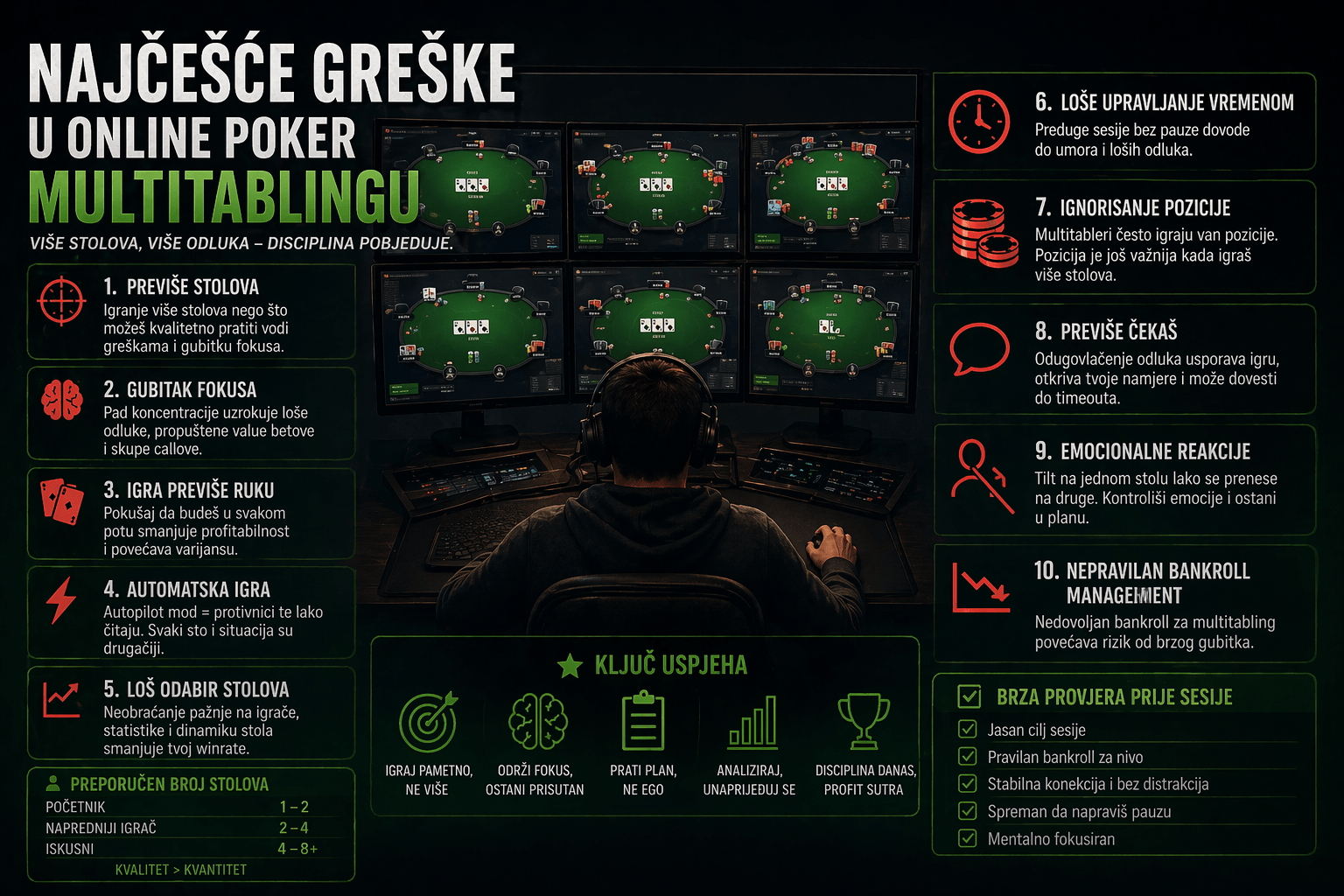 Zato multitabling nije samo tehnička veština otvaranja više prozora. To je test fokusa, rutine, selekcije stolova, samokontrole i sposobnosti da i dalje primećuješ detalje dok se akcija ubrzava. Najveća ironija je što mnogi igrači krenu na više stolova da bi zaradili više, a završe sa manjim winrate-om, više tilta i gorim odlukama u spotovima koji prave najveću razliku.